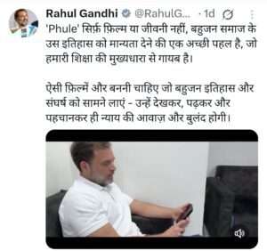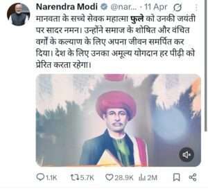प्रधानमंत्री नरेंद्र मोदी ने ज्योति बा फूले की जन्म जयंती के दिन एक्स यानी ट्विटर संदेश देते हुए फूले पर डिस्प्ले फीचर पोस्ट किया लेकिन फिल्म ‘फूले’ का उन्होंने कोई जिक्र नहीं किया।