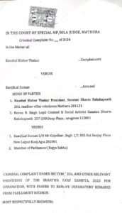 सनातन धर्म रक्षा पीठ के चर्चित पीठाधीश्वर ठाकुर कौशल किशोर महाराज और सुप्रीम कोर्ट की वरिष्ठ अधिवक्ता रीना सिंह ने संयुक्त रूप से न्यायालय में याचिका दायर कर आरोपी सांसद को दण्डित करने की मांग की है। भारतीय न्याय संहिता के सेक्शन 356 के तहत दोनों ने मथुरा के विशेष एम एल ए, एम पी कोर्ट में वाद दायर कर मांग की कि आरोपित सांसद को कोर्ट में हाजिर कराकर माफ़ी मंगवाई जाये और दण्डित किया जाये।